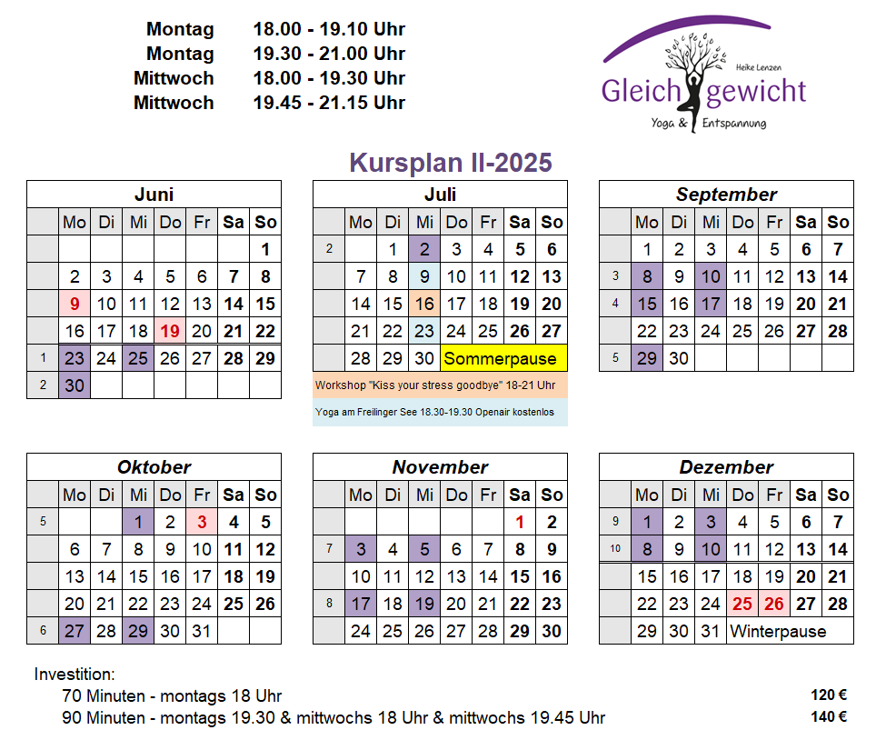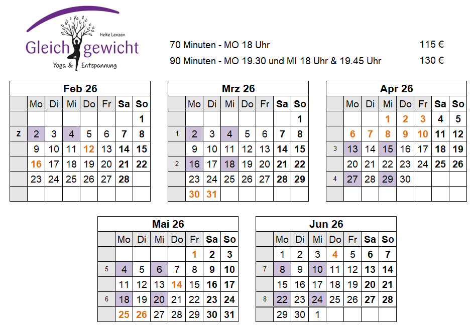 Grds. finden die Yoga-Präventions-Kurse an den lila hinterlegten Tagen statt (die Kurse sind auf die vorgegebenen Zeiträume festgelegt).